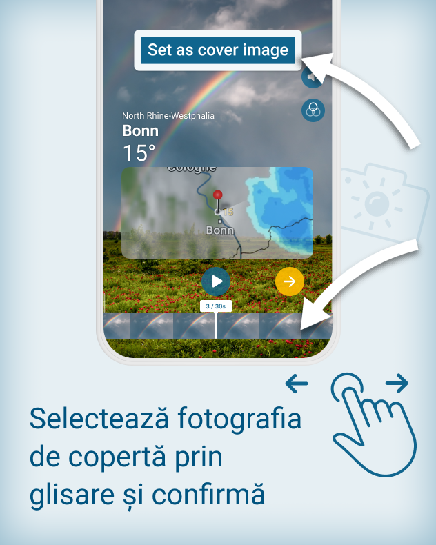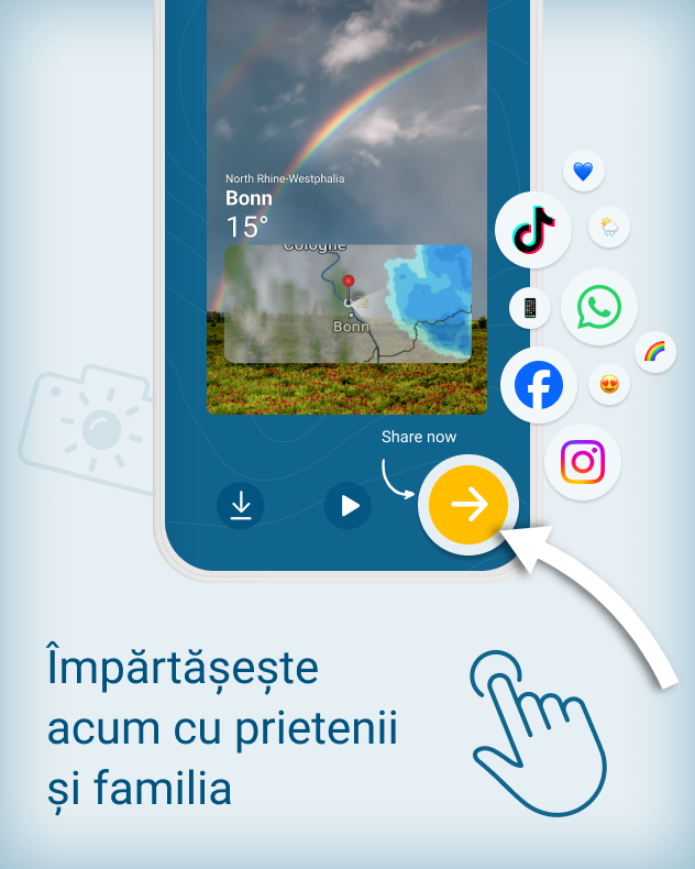 Cu noua funcție din aplicația Meteo & Radar poți filma aceste momente – rapid, ușor și direct din aplicație. Personalizează pe loc videoclipul cu muzica și filtrele dorite. Locul unde te aflii, ora și imaginile radarului meteo sunt adăugate automat.