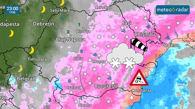 Și miercuri dimineața va ninge viscolit în estul țării, dar după-amaiza vremea se va ameliora. În multe locuri va ieși Soarele, iar în vest, centru și sud-vest se va încălzi destul de mult. În schimb, temperatura va rămâne sub 0°C în estul Moldovei și nordul Dobrogei.