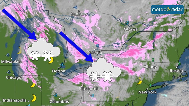 Radarul meteo: Un vânt rece din nord-vest adună umezeala de deasupra Marilor Lacuri. Acest lucru duce la formarea unor benzi de precipitații distincte.