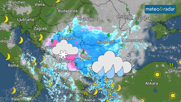 Radarul meteo arată ploi abundente și ninsori în sud-estul Europei.