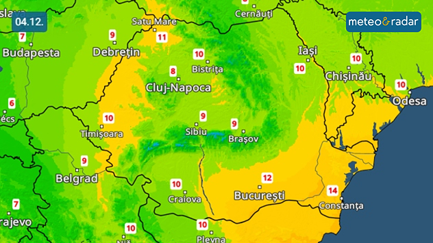 Radarul temperaturilor: Joi, 4 decembrie, termometrele vor arăta până la 10 - 14°C în majoritatea regiunilor țării.
